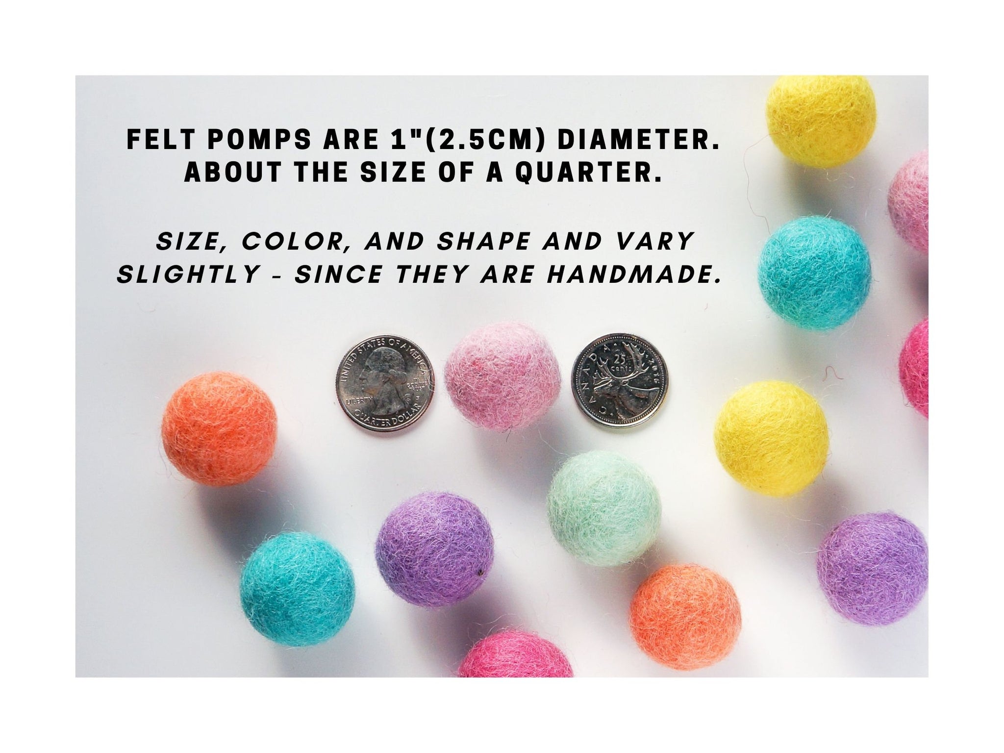 These felt balls are handmade items and can vary slightly in size, colour, and shape.