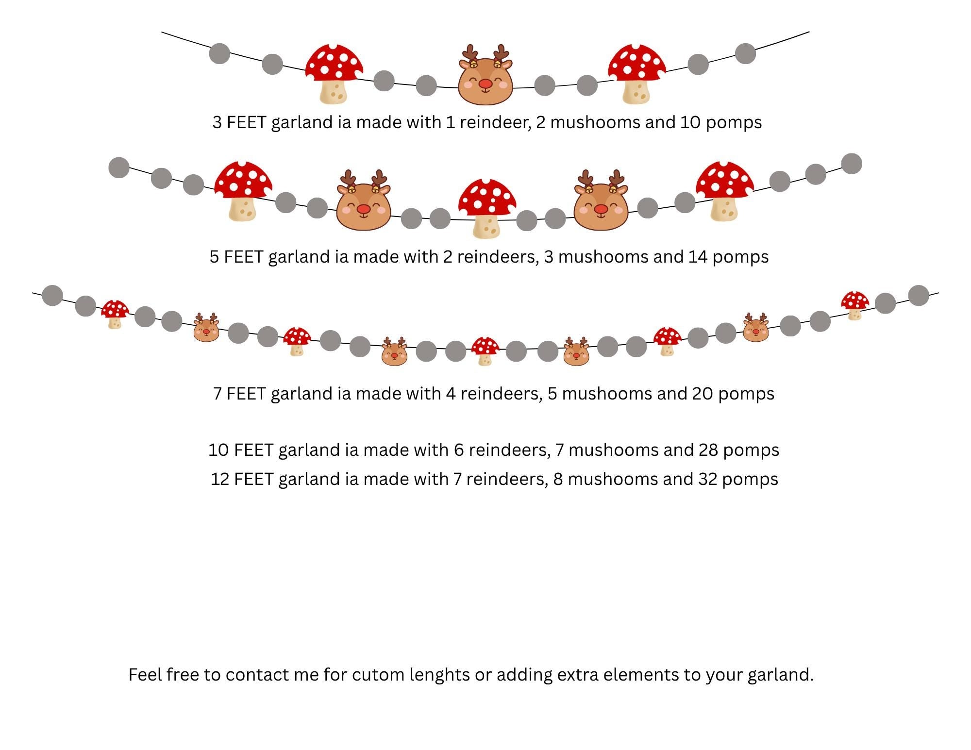 - 10ft (3 m) length - made with 28 pomps, 6 reindeers, 7 mushrooms