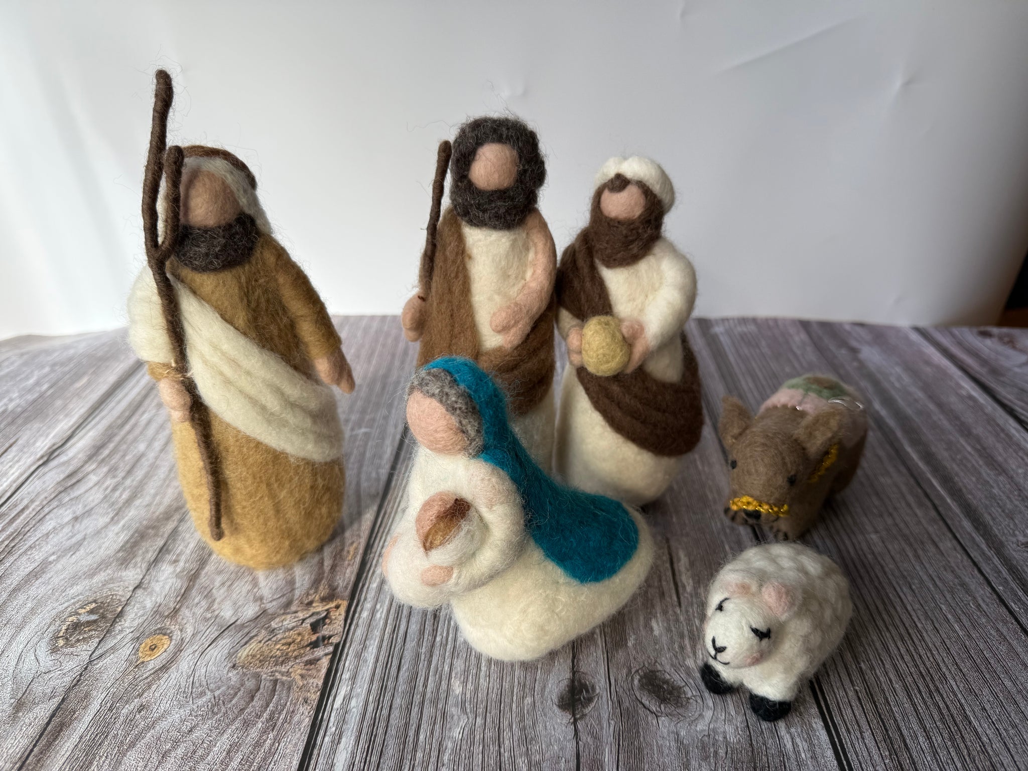 Needle Felted Nativity Set. The felted Holy Family set is made with 100% wool.